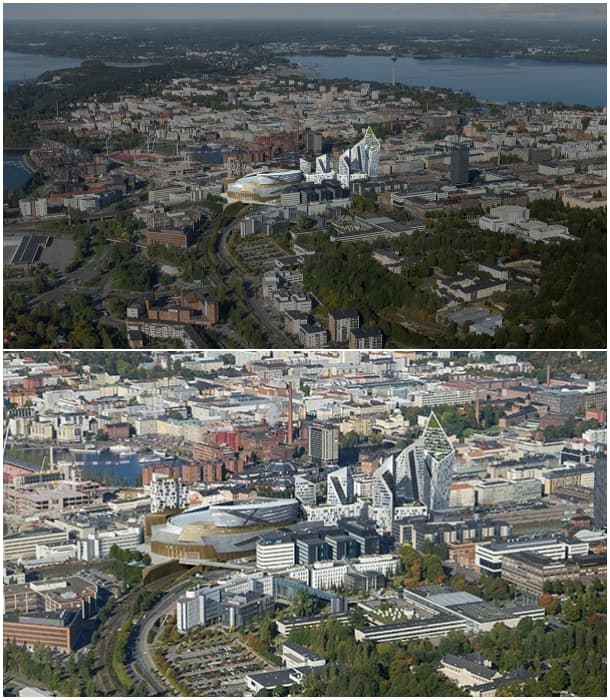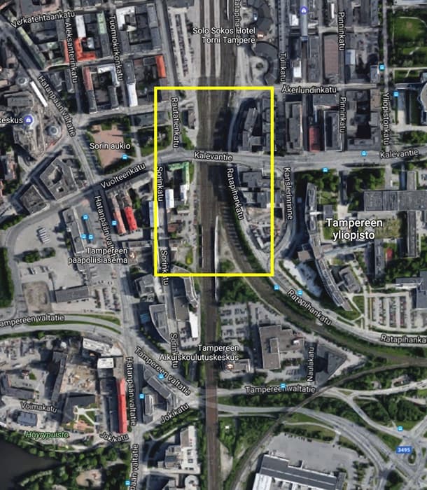 Este proyecto tiene un doble programa que abarca una superficie 60.000m2. Incluye la construcción de un pabellón cubierto (Arena), y unos volúmenes de uso mixto. Un aspecto interesante de esta actuación es su emplazamiento: haciendo de puente sobre unas vías de tren. Así es, porque aparte de estar ubicado en el centro de Tampere, este desarrollo urbano mantiene intactas las vías férreas.