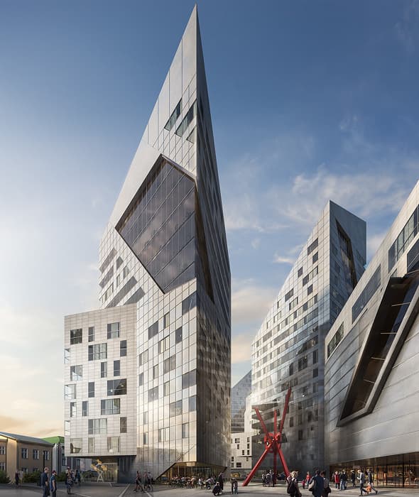 El resto se completa con volúmenes de diferentes alturas, de cubiertas inclinadas, y fachadas irregulares. Todo ello siguiendo el lenguaje característico del tipo de arquitectura que diseña Libeskind. Hay cuatro bloques de oficinas que están rematados por apartamentos, y un hotel con espacios residenciales en la parte superior.