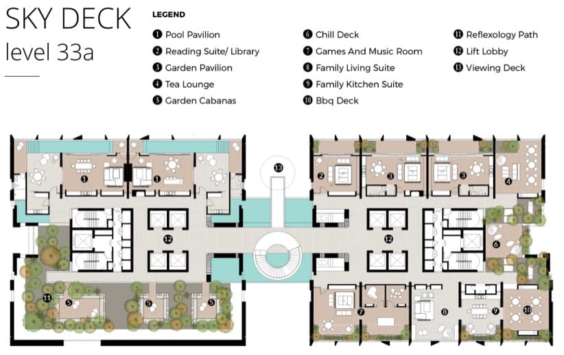 Entre los niveles 33 y 35 se han dispuesto unos miradores, con espacios para el entretenimiento. En la azotea hay más espacios para relajarse, y otra piscina más, desde la que se tiene impresionantes vistas sobre la ciudad.