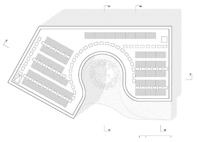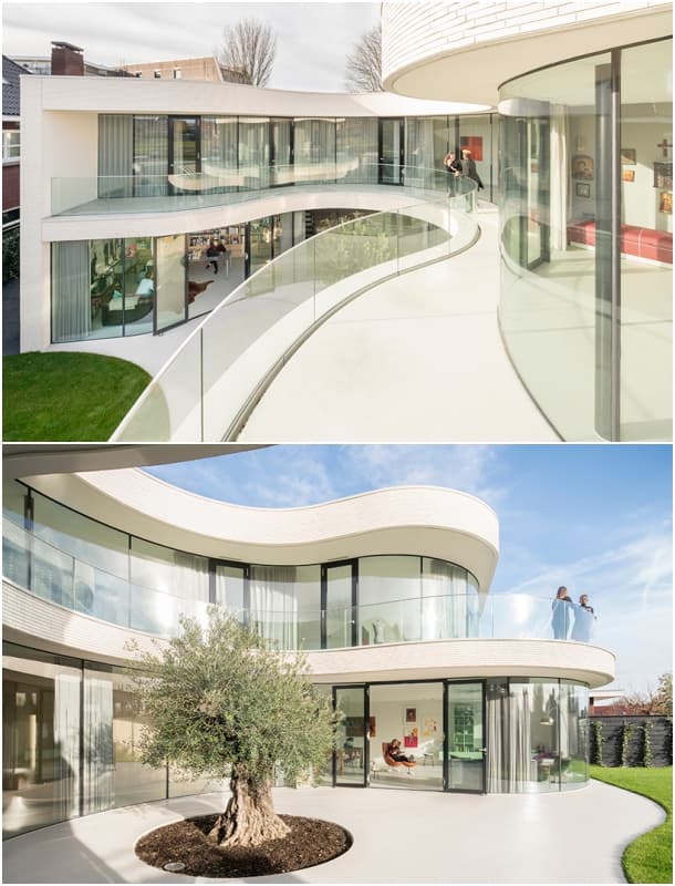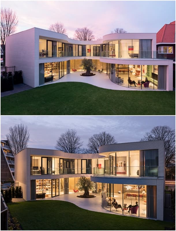 Desde la calle el edificio apenas tiene huecos que muestren algo de la actividad de sus ocupantes. Es una fachada de ladrillo visto, en color claro, con una sinuosidad que marca la entrada. En cambio la parte trasera está completamente abierta hacia el sur, con una fachada curva de vidrio que rodea a un olivo en su parte central.