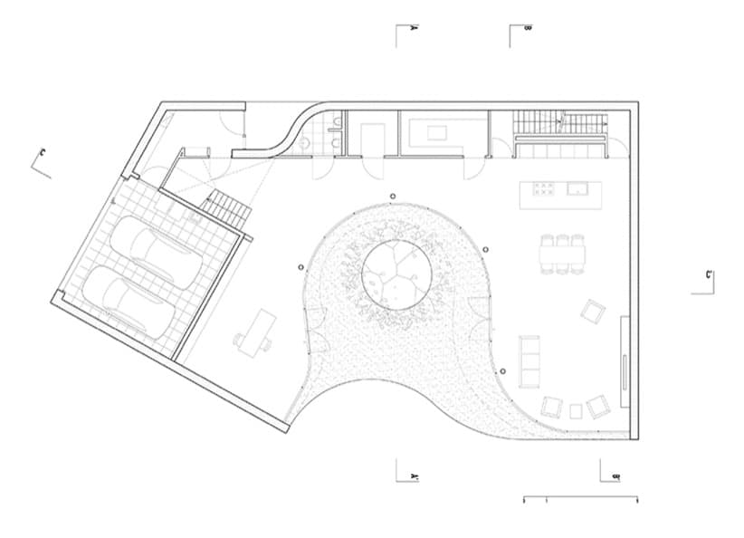 Una vez dentro, lo primero que vemos es la escalera principal, y un luminoso espacio con un vidrio curvo de telón de fondo. A un lado está la sala de la biblioteca, y al fondo la cocina, comedor, y sala de estar. Desde cualquier punto de este nivel se está viendo el patio con el árbol antes mencionado.