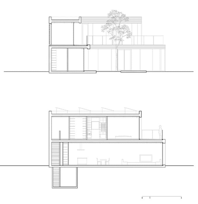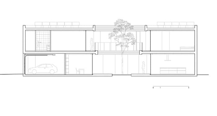 Un bello detalle es que el suelo del interior continúa hacia el patio. De esta manera convierte el patio como una extensión de la vivienda. Se supone que en días de lluvia y viento, ni siquiera el agua va a entrar bajo las puertas de salida al patio. Decimos esto porque esta fachada está protegida por el voladizo del piso superior. En este sentido, la doble puerta que hay en la biblioteca, es el punto más vulnerable (ver plano de planta baja).