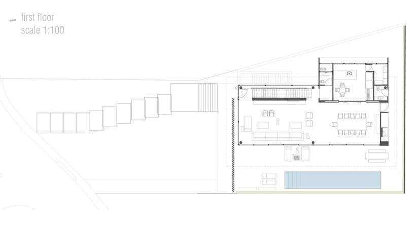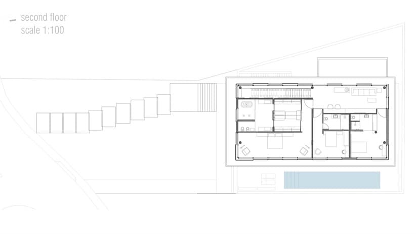No hay mucho misterio. Considerando que la parcela (lote) es relativamente estrecha, y que había que dejar espacio para la piscina, se entiende ahora la posición lateral de la escalera de esta casa. La escalera termina en una sala con un sofá, que también funciona como estudio. Gran parte de la superficie de esta planta está ocupada por la suite. Es un dormitorio alargado, que tiene un gran vestidor, y al fondo el cuarto de bajo. Es una organización típica de las casas de lujo.