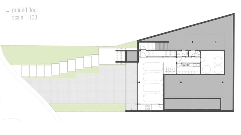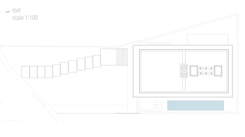 Situado entre la escalera y la cocina, está el aseo. Hay otro aseo, accesible desde el patio trasero de la casa, por llamarlo de alguna manera, ya que es muy estrecho. Precisamente en la fachada trasera se ha dispuesto un espacio para la barbacoa. Es una posición bastante estratégica, ya que todo el lateral de la Casa Bravos está ocupado por una estrecha piscina, y su terraza. Desde la calle las vistas están interrumpidas por un hermoso brise soleil de madera cumaru.