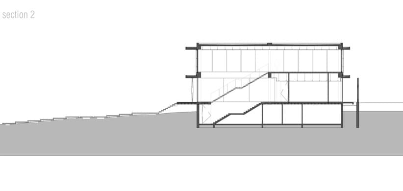 Como suele ocurrir con las casas brasileñas, este edificio también se organiza de una manera un tanto diferente. Justo en la entrada vemos la escalera. Es lineal y está adosada a un muro de hormigón visto. La escalera está hecha con dos perfiles metálicos, y sus huellas son de madera maciza.