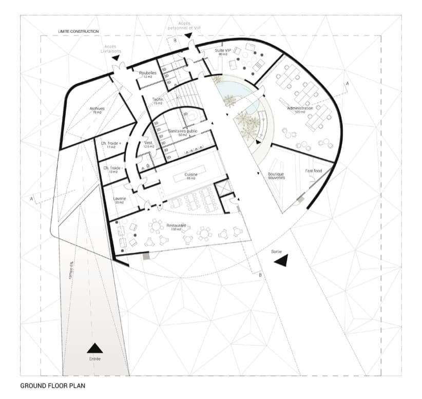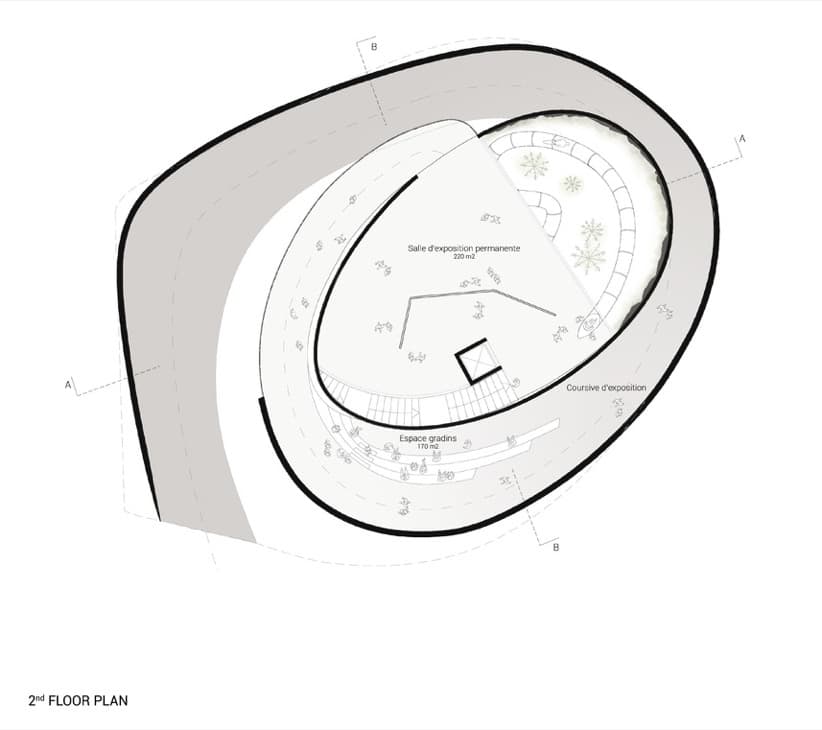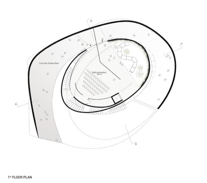 La entrada se realiza a través de una rampa que conduce al visitante a la primera planta. Allí encontrará el espacio central del edificio, que tiene múltiples funciones. En el nivel inferior está la sala VIP, oficinas de administración, almacenamiento, y baños. El segundo nivel es el que tiene los techos más altos, y está dedicado a la exposición temática. Para bajar desde la segunda planta, se tiene la opción de hacerlo por unas escaleras, ascensores, o un tobogán curvo que atraviesa un patio.