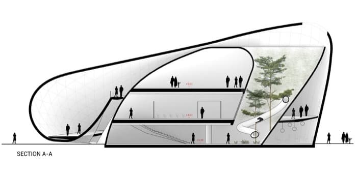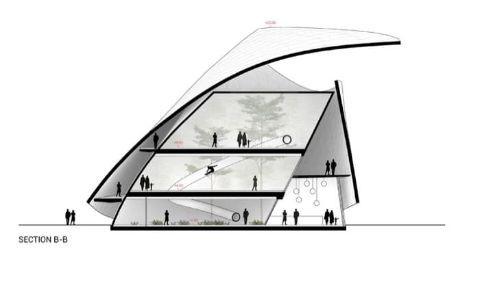 Estas imágenes y planos tienen que ver con el proyecto para el Pabellón de Luxemburgo Expo 2020 en Dubái. Como suele ser habitual en este tipo de edificios, surgió de un concurso de ideas.