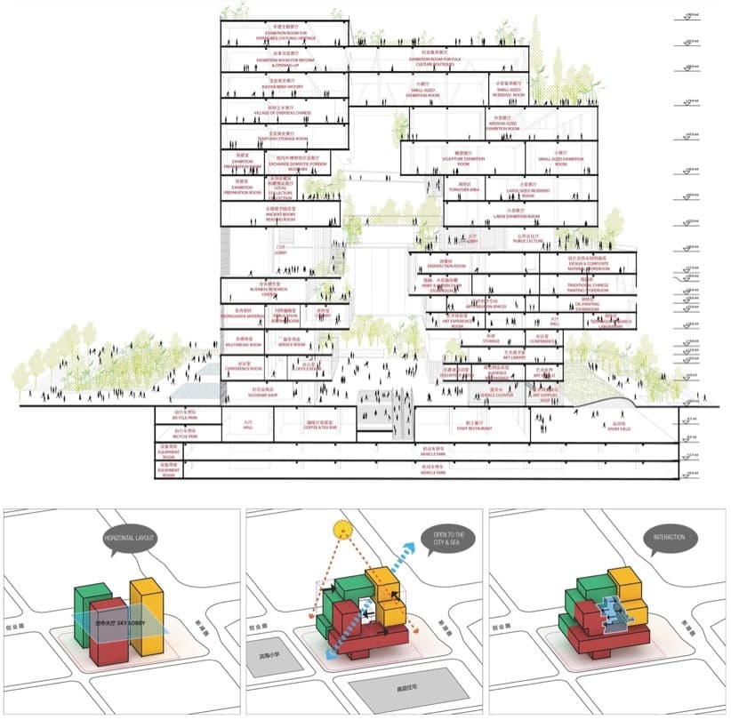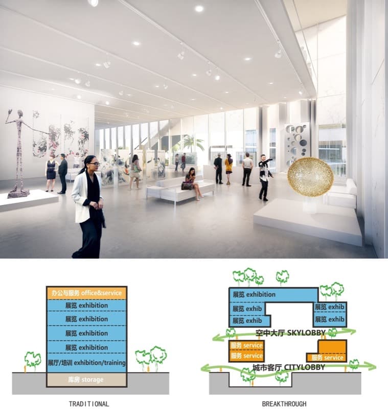 Los más de 80.000m2 del proyecto están divididos en tres piezas: museo, galería de arte, y sala de exposiciones. El vestíbulo de planta baja (llamado city lobby) está conectado con una estación de metro, y da la bienvenida al visitante con varios puntos de venta.