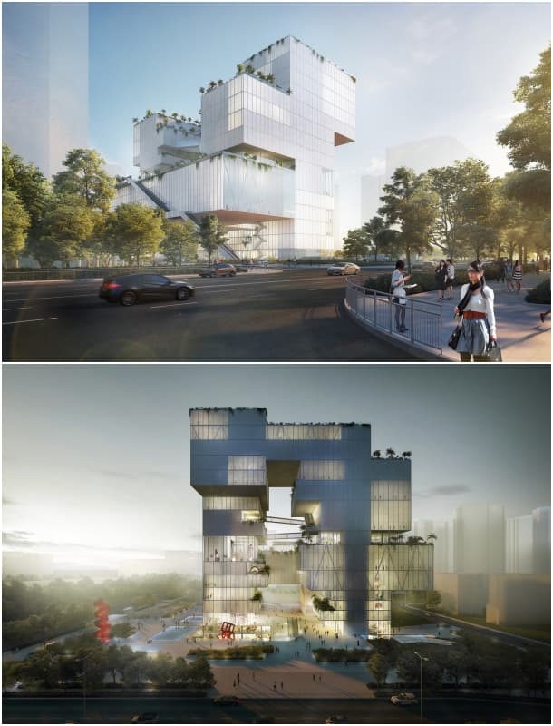 Estas imágenes renderizadas son del proyecto para el Centro Cultural de Bao’an, una ciudad-distrito de Shenzhen (China). Ganó el primer premio de un concurso internacional, en el que competían 70 ideas.
