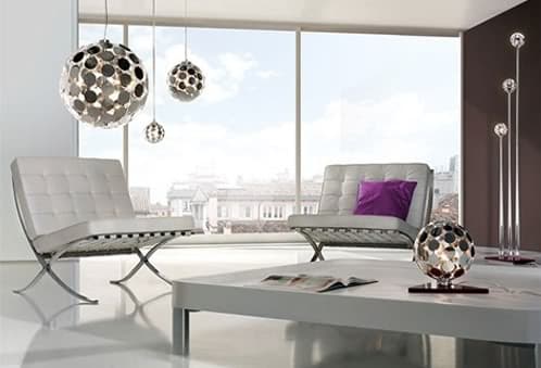 Esta lámpara esférica es desde luego un modelo moderno, sutil y con cierto carácter retro. Muy a tener en cuenta también: las sombras que su matriz de discos proyecta sobre las superficies que definen la habitación.