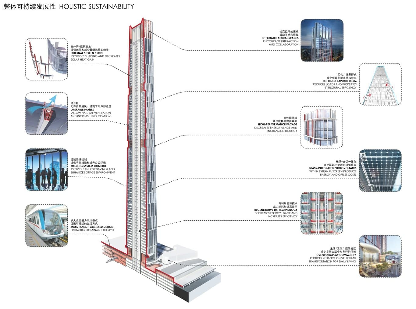 Este proyecto implica la construcción de 315.000m2, repartidos en tres edificios, alcanzando el más alto una altura de 400 metros. Es un rascacielos de oficinas que simboliza la visión futura de Wuhan: equilibrio entre desarrollo y sostenibilidad.