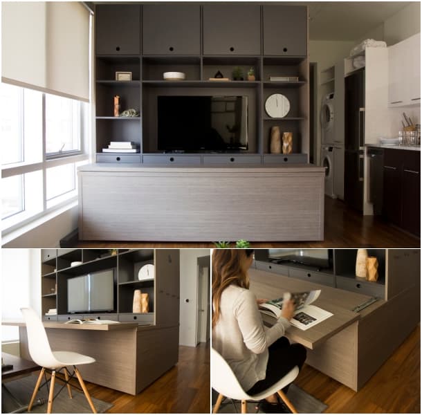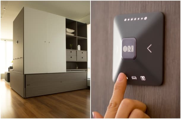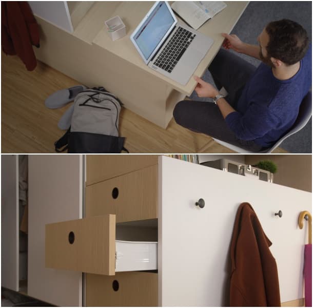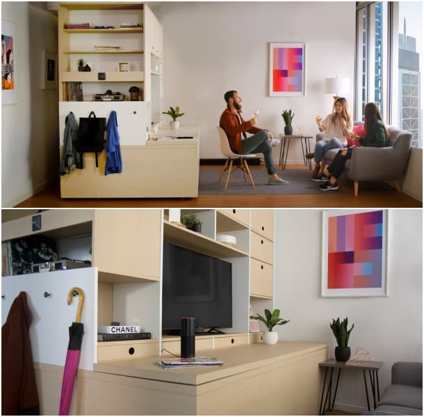 Los apartamentos urbanos son pequeños, caros, y muy estáticos en sus funciones. Pero este mueble convertible quiere acabar con esa tendencia, porque crea espacios dinámicos. Esto es genial, porque un estudio de apenas 20m2 se puede utilizar sin agobios. Todo lo que hay que hacer es montar este mágico mueble, y enchufarlo a una toma de corriente. Entonces se puede controlar desde su pequeño panel, una aplicación móvil, e incluso comandos de voz (Alexa).