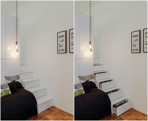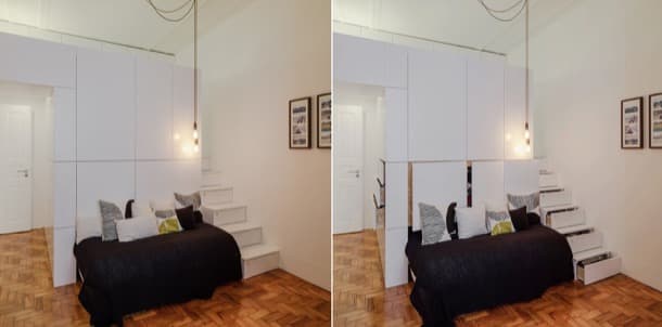 En este ejemplo se diseñó un mueble repleto de armarios, cuya plataforma superior sirve de estudio. En su parte inferior cabe una cama, que cuando está escondida libera bastante espacio en el cuarto. Puede sacarse una parte, y utilizarse como sofá, o entera para funcionar como cama.