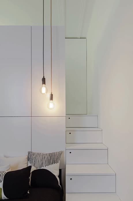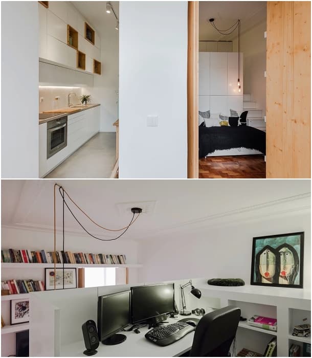 Esta rehabilitación se ubica en un edificio de los años 1940, de un antiguo barrio industrial de Lisboa. Se trataba de una vivienda (de 70m2) con pequeñas habitaciones, poca luz natural, conectadas por un pasillo. Pero la altura libre (de suelo a techo) era suficiente para colocar un altillo en una de las habitaciones: 3,26m.