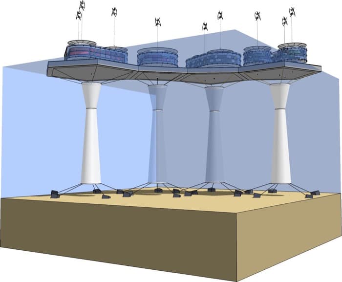 Es interesante también el sistema empleado para el anclaje de las plataformas. Se hace con unos tubos submarinos verticales que actúan como grandes chimeneas que crean una corriente vertical de agua (por diferencia de temperatura). Este método colabora en la amortiguación del oleaje.