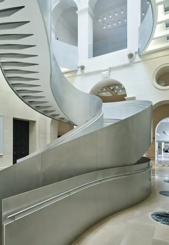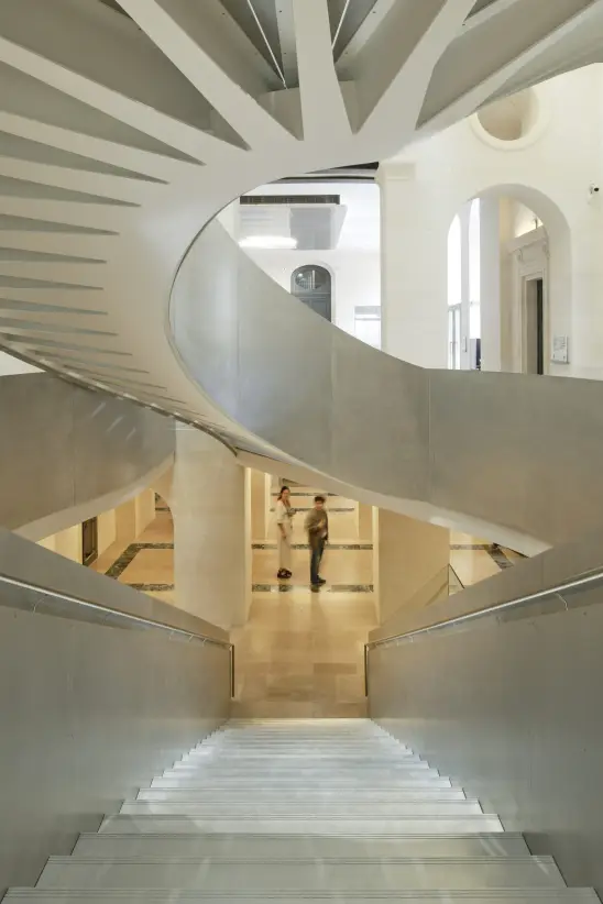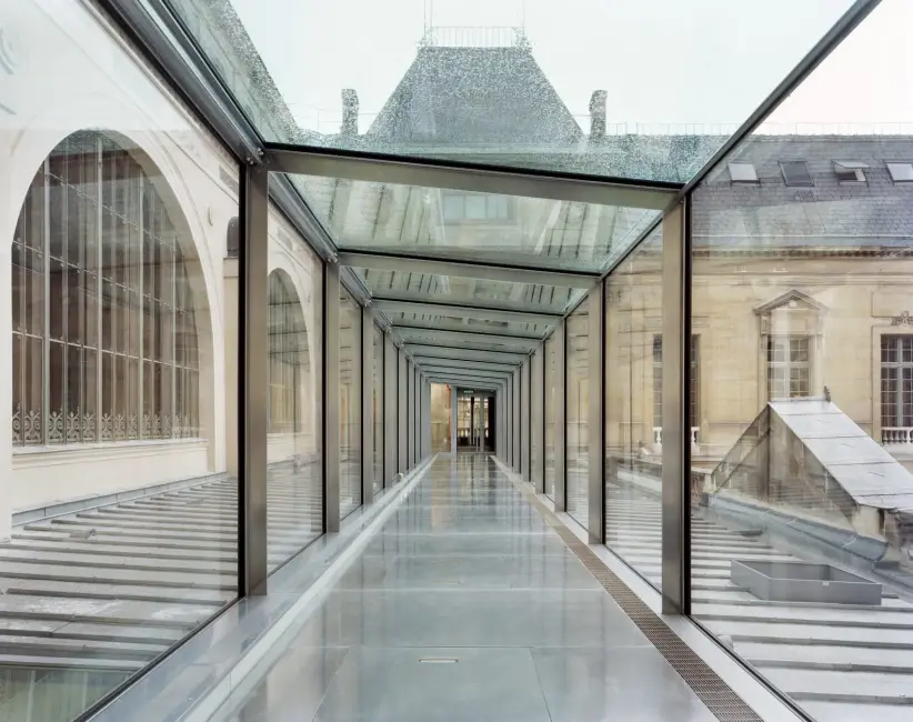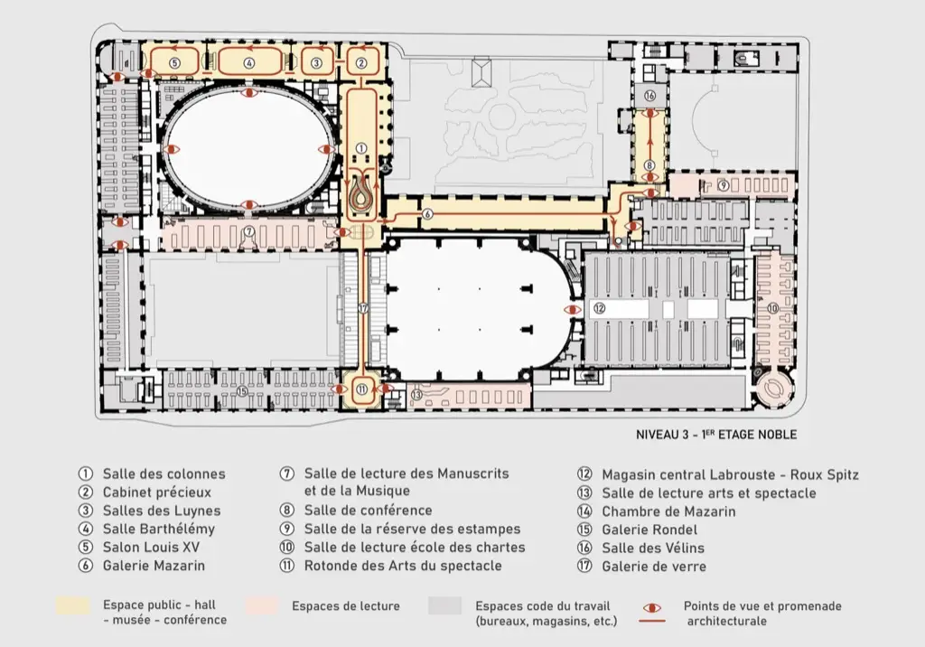 El espacio central de la biblioteca ha sido objeto de muchas transformaciones históricas, y Bruno Gaudin Architectes ha optado por hacer una característica de su historia en capas. Por eso se ha creado una gran sala de lectura unida por escaleras y pasillos de acero. En el primer piso, el este y el oeste del sitio han sido conectados por una nueva «galería de vidrio”. Es un corredor acristalado con piso de vidrio que ofrece vistas a través del techo y conduce a un nuevo espacio del museo, y al departamento de monedas, medallas, y antigüedades.