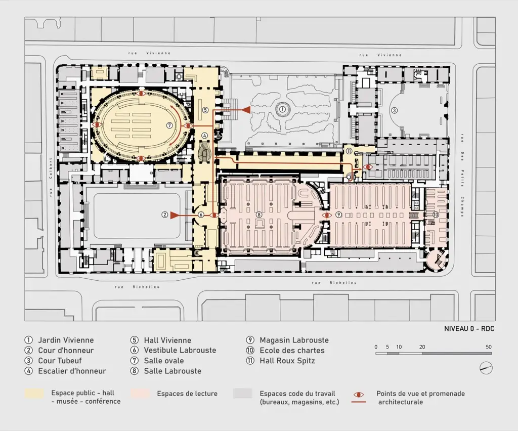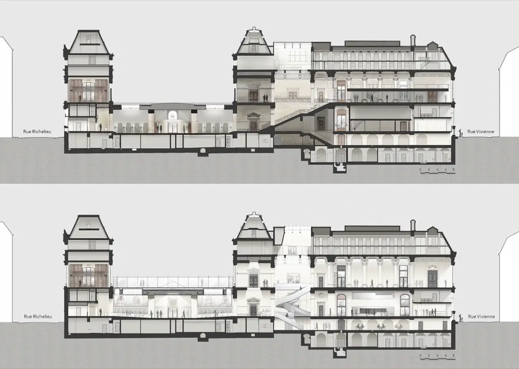 Tras una extensa remodelación, el sitio de la rue de Richelieu alberga ahora salas de lectura para la Biblioteca Nacional de Francia, la Biblioteca del Instituto Nacional de Historia del Arte, y la Biblioteca de la École Nationale des Chartes. La remodelación se dividió en 2 fases. La primera se completó en 2016 y se centró en reconfigurar la circulación en el frente del edificio a lo largo de la rue Richelieu. La segunda fase, recientemente completada, ha creado una entrada completamente nueva y un patio ajardinado según la rue Vivienne. Eso ha convertido las antiguas fachadas traseras del edificio en una nueva fachada abierta.