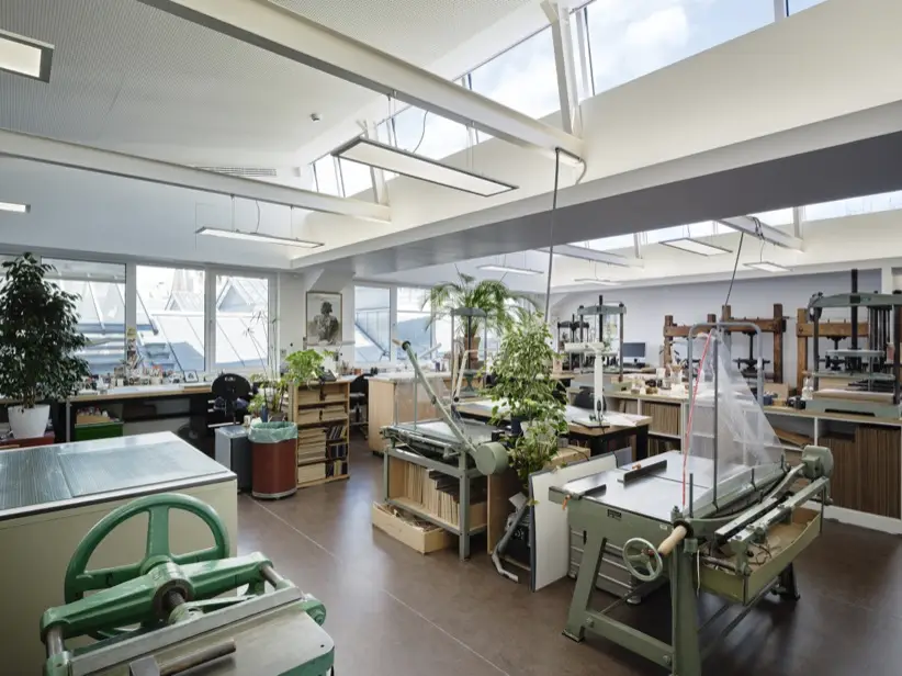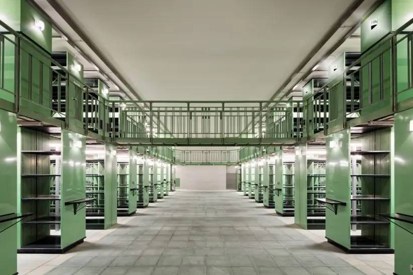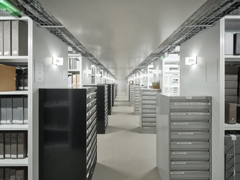 Detrás de escena, las áreas internas incluyen áreas de almacenamiento de archivos recientemente creadas y restauradas. También aparecen espacios amplios y aireados para el personal en el ático de la biblioteca.