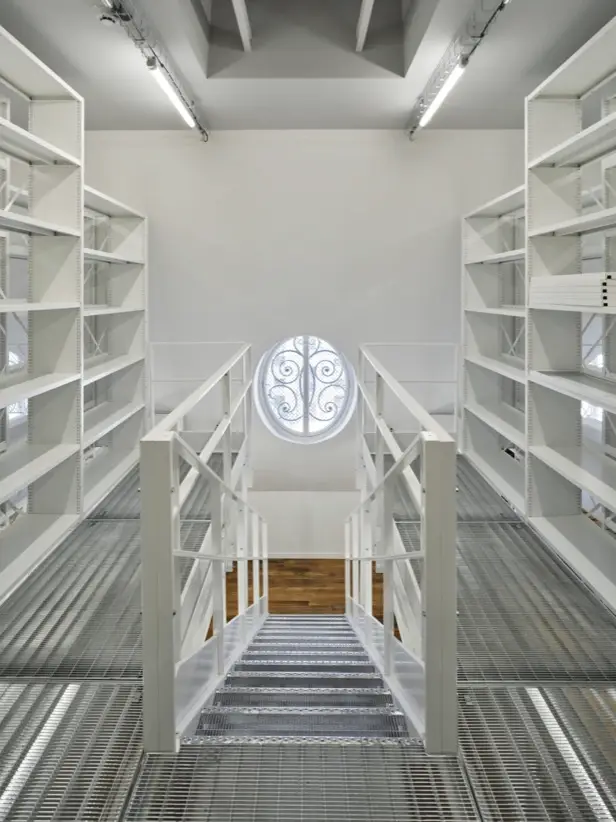 El trabajo en las áreas de almacenamiento de la pila de libros brindó la oportunidad de subrayar la reinterpretación y transformación de un espacio histórico importante en el sitio.