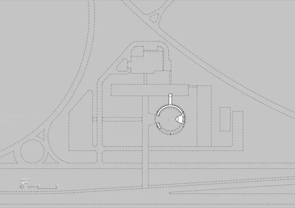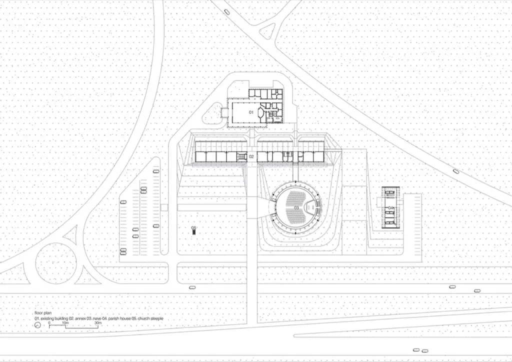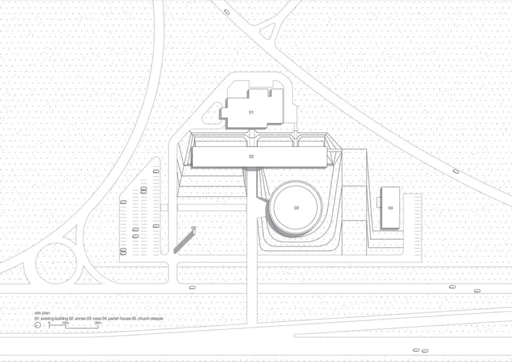 El proyecto arquitectónico comprende una iglesia ya existente, un anexo lineal, la nave circular, una casa parroquial, y un monolito de hormigón. Estas estructuras fueron meticulosamente diseñadas para realzar la línea del horizonte en este terreno plano.
