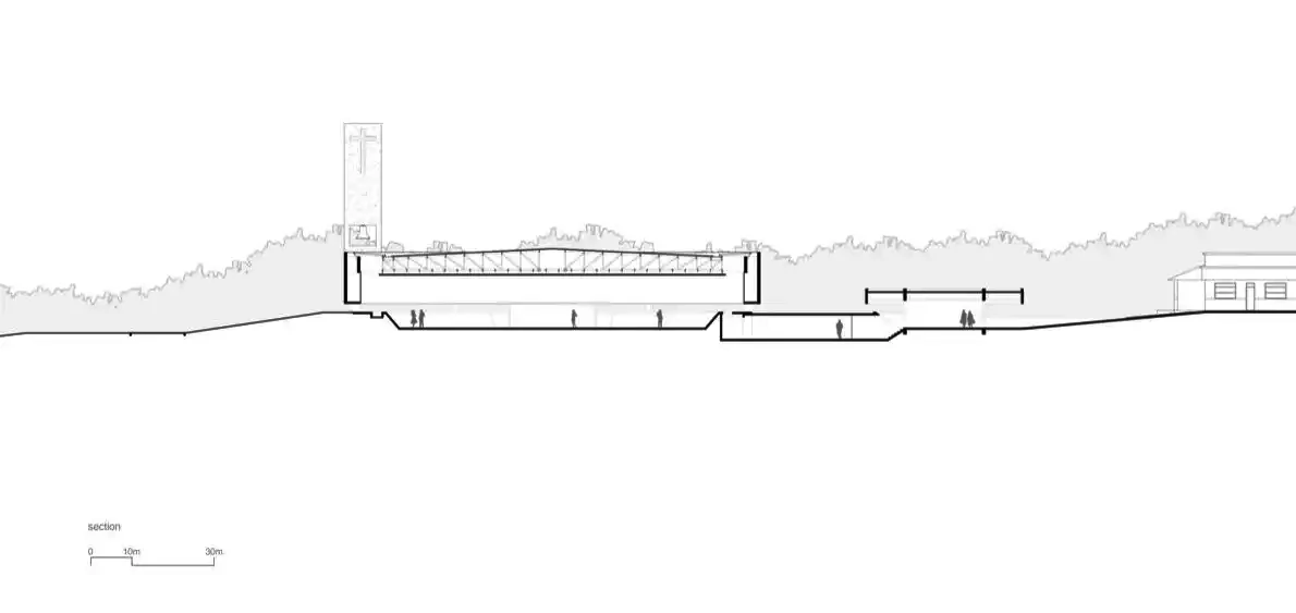 Para preservar la integridad de la forma, se accede a la iglesia a través de un recorrido axial, que se transforma en una rampa. Hay un eje que conecta la nave, el edificio anexo, y la iglesia preexistente de techo rojo, la cual se utiliza para actividades parroquiales.