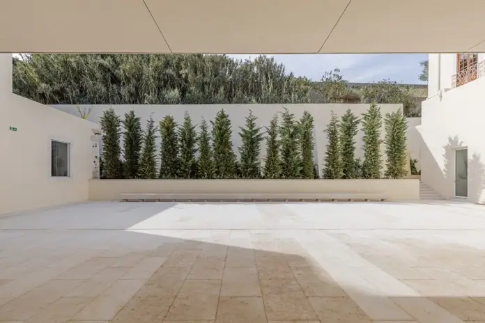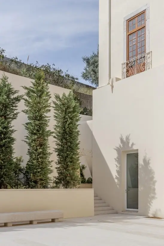 Aparte de la renovación estructural, se han incorporado dos nuevos aparcamientos, uno en superficie y otro subterráneo. También hay espacios exteriores entre los distintos edificios del convento. Estos espacios se han terminado con piedra pálida y yeso blanco, añadiendo un toque de elegancia a la renovación.