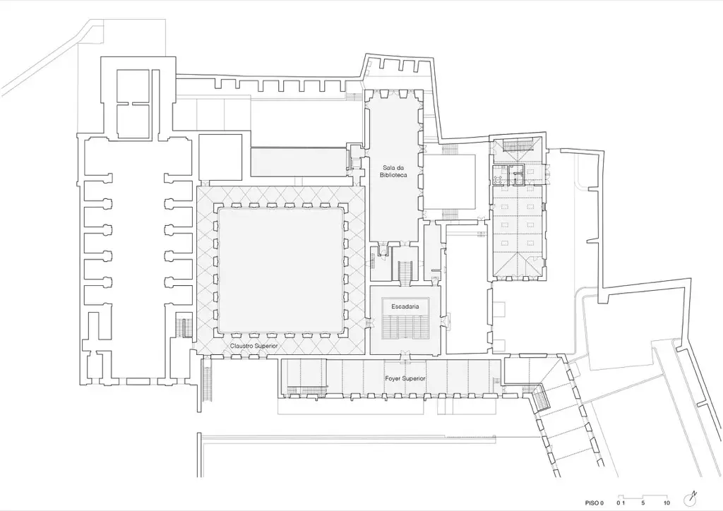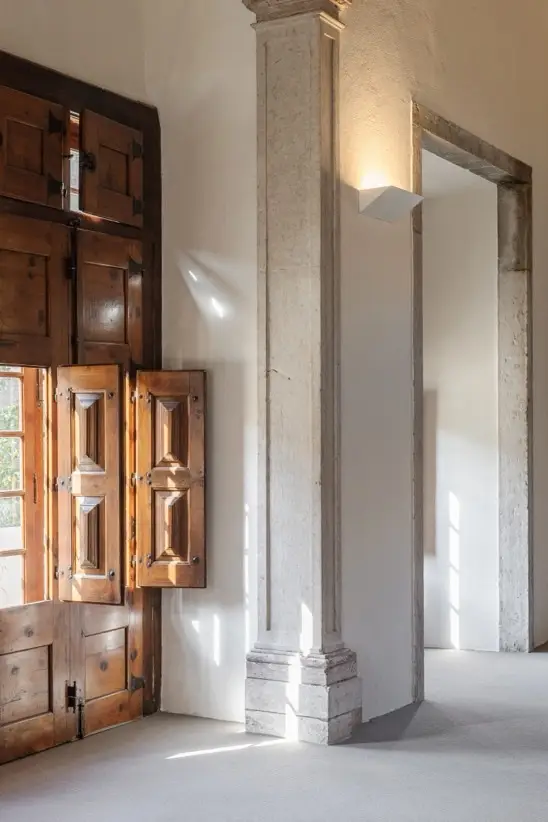 En el proceso de intervención a gran escala, se ha optado por un enfoque contemporáneo. Se han suspendido accesorios de iluminación moderna del techo de madera sobre la escalera de piedra del convento. Y se ha instalado una nueva escalera de emergencia sostenida por delgadas columnas de acero.
