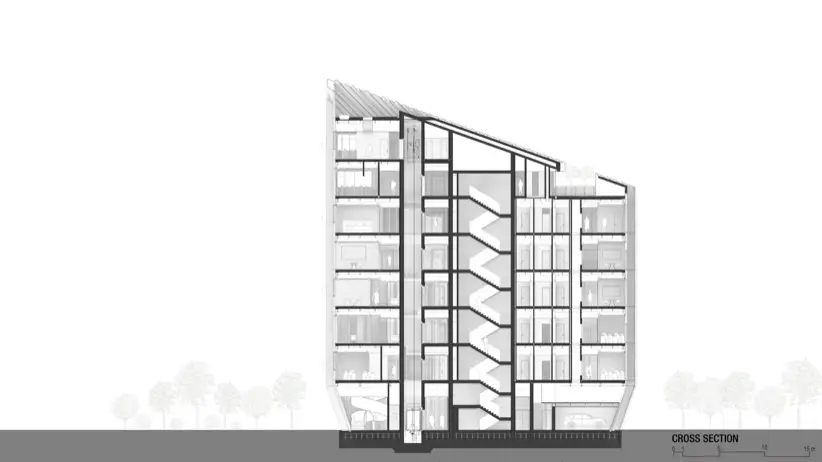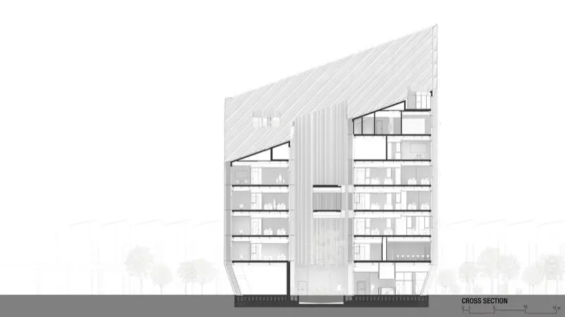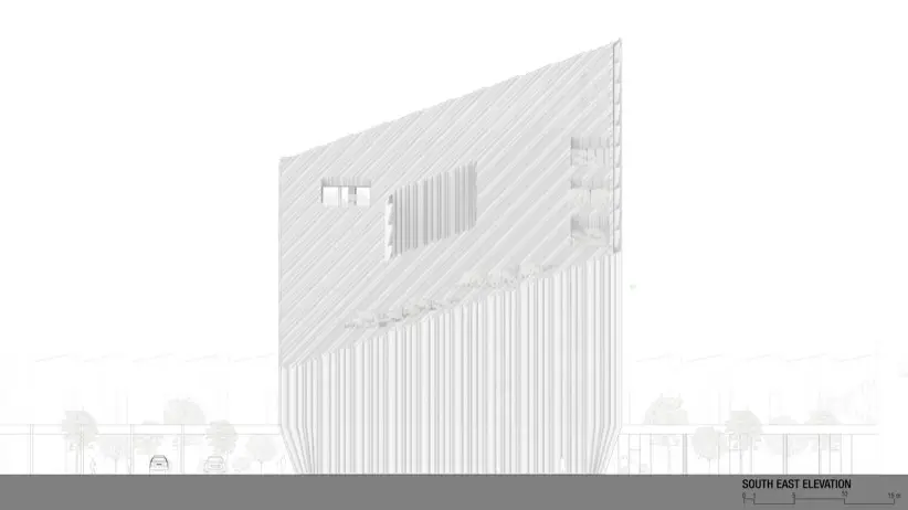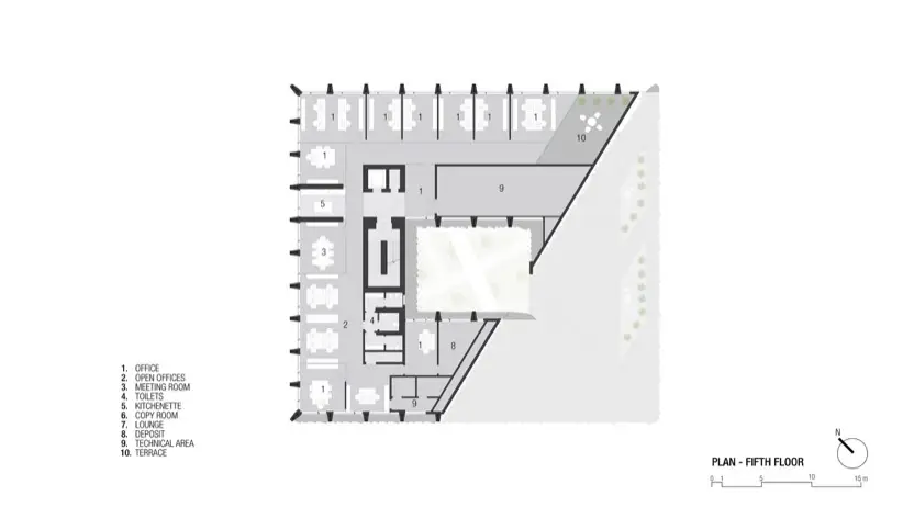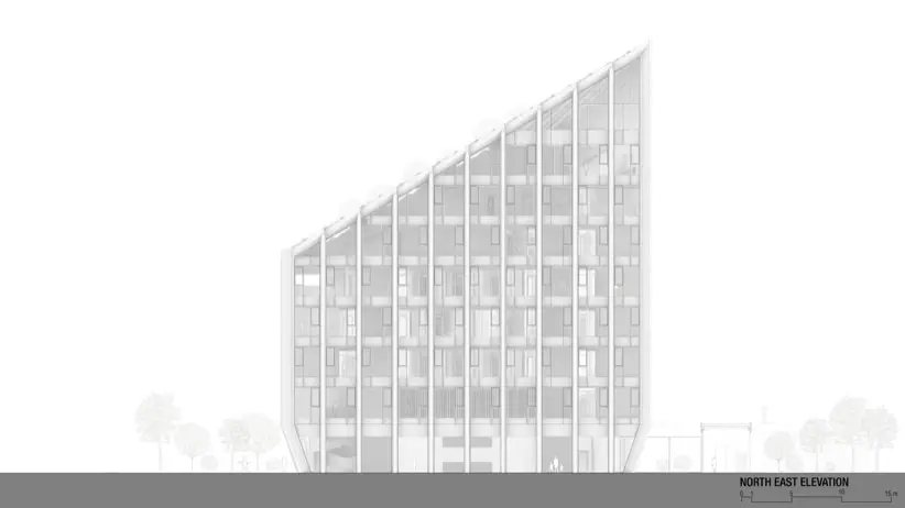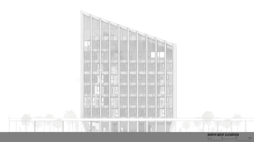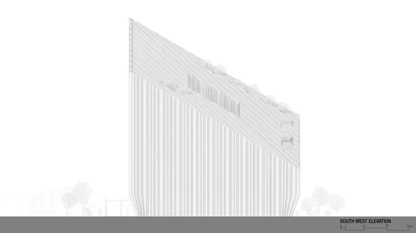 Uno de los aspectos más destacados del diseño es su cubierta inclinada, una decisión no solo estética sino también funcional. El objetivo de esta inclinación es maximizar la exposición a la luz natural indirecta en las fachadas orientadas al norte. Eso reduce la dependencia de la iluminación artificial durante el día, y también crea un ambiente de trabajo más saludable. Este enfoque sostenible se refleja en todo el diseño del edificio. Se nota en la selección de materiales, y las soluciones de ingeniería aplicadas para garantizar eficiencia energética y confort térmico.