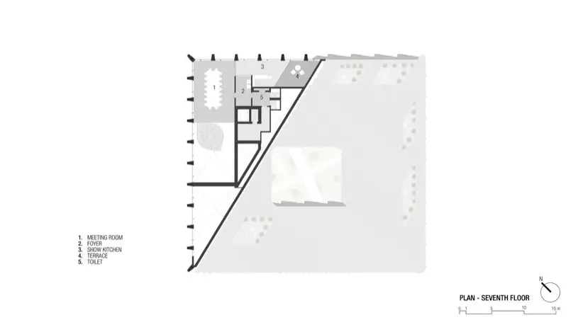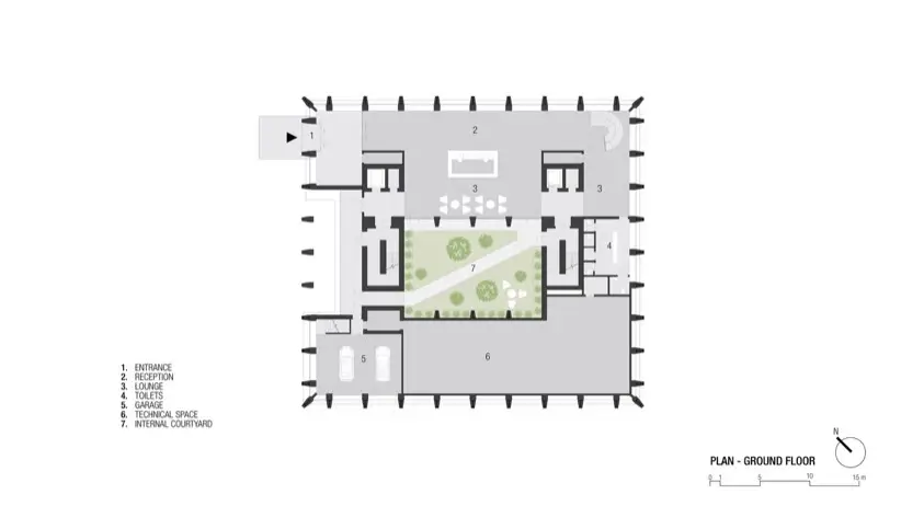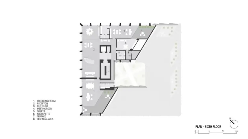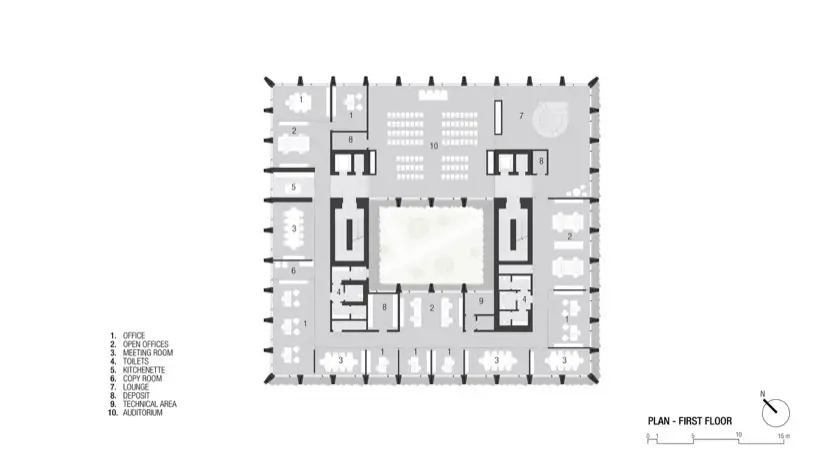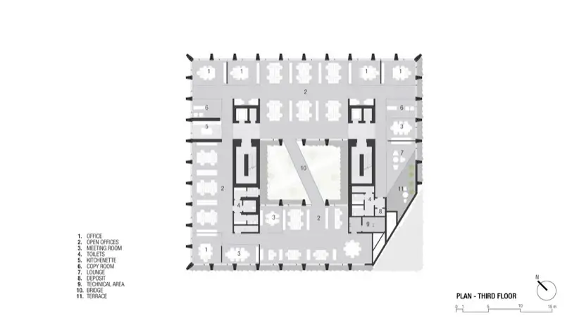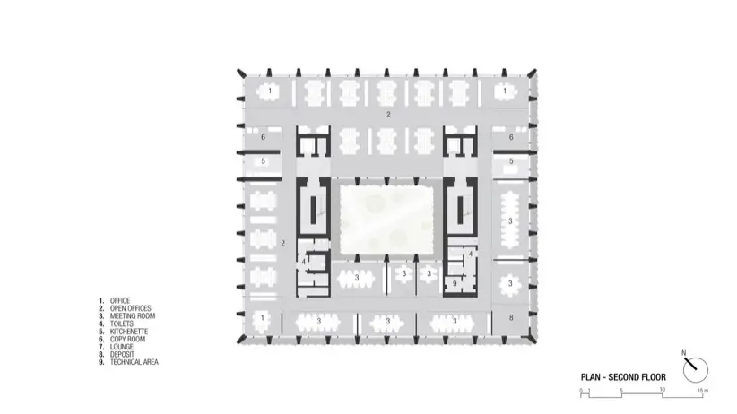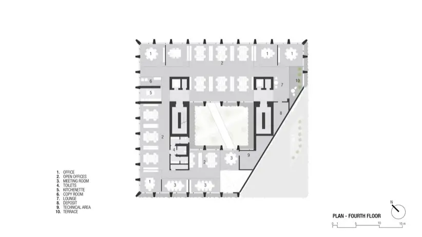 El diseño interior del edificio también merece atención especial. El patio central es un oasis visual, y funciona como un sistema de ventilación natural a través del efecto chimenea. Mejora la calidad del aire interior sin comprometer la seguridad o la eficiencia energética. Además, el puente de vidrio que cruza este espacio en el tercer piso facilita la comunicación entre departamentos. Este elemento fomenta una mayor colaboración y sinergia entre los empleados.