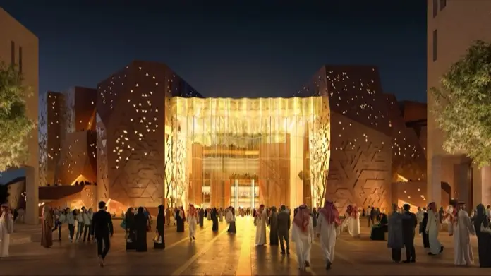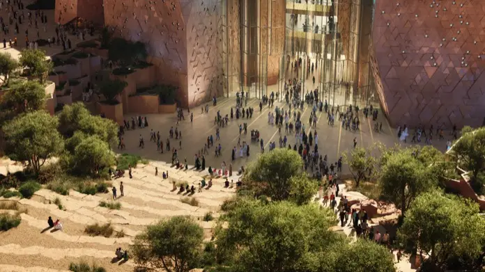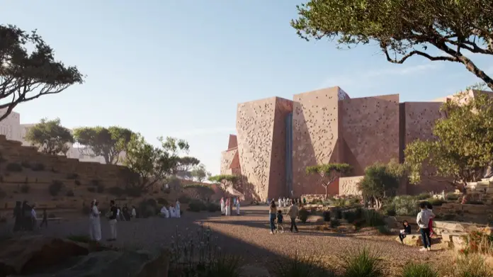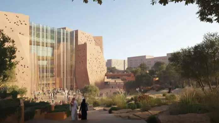 La arquitectura surge del paisaje como una serie de monolitos, que evocan formaciones geológicas locales y aluden a los antiguos fuertes y palacios de Najdi.