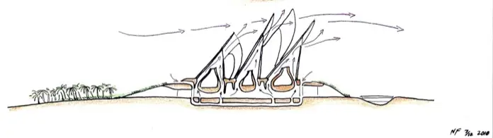 El diseño arquitectónico del Museo Nacional Zayed combina una forma contemporánea altamente eficiente con elementos de diseño y hospitalidad árabe tradicional. Las galerías del museo se alojan dentro de un montículo ajardinado hecho por el hombre, que simula la topografía de los Emiratos. Sobre este montículo, se elevan cinco estructuras ligeras de acero, esculpidas aerodinámicamente. Estas torres no solo son visualmente imponentes, sino que también funcionan como chimeneas térmicas. Atraen corrientes de aire de enfriamiento de forma natural para el museo. Lo hacen capturando aire fresco a nivel bajo y liberándolo en el vestíbulo del museo.
