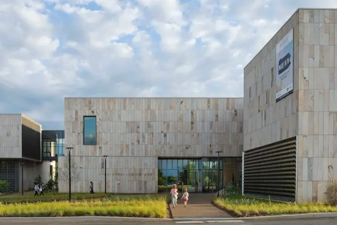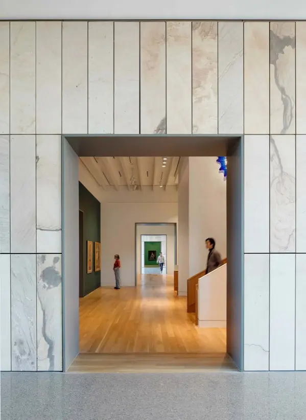 Este diseño evita el cliché del “museo brillante” que se impone sobre el visitante. Nada de eso: aquí manda la idea de recorrido y respiro. Dos volúmenes revestidos de piedra arenisca se enlazan con un puente acristalado en la segunda planta, creando patios y terrazas que juegan con la escala. El interior ofrece galerías de alturas variables, espacios íntimos seguidos de dobles alturas que sorprenden. Es un museo que invita a moverse, no a perderse en un laberinto oscuro. El material tampoco es capricho: la arenisca local conecta literalmente la arquitectura con Pensilvania, geología incluida. Esa conexión con la tierra es un guiño elegante, aunque algunos lo vean como detalle simbólico más que estructural.