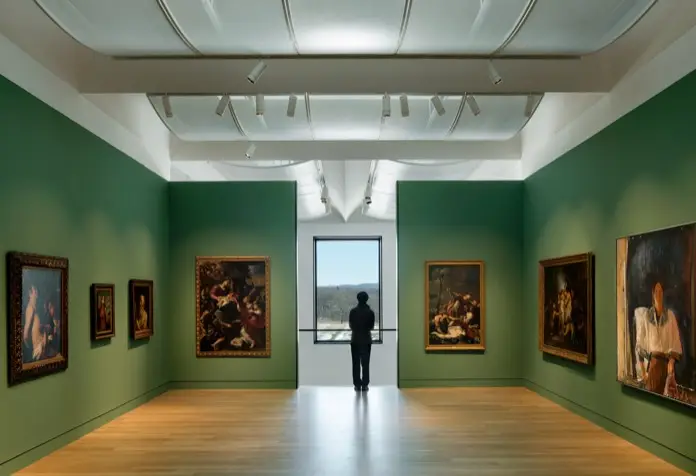 El nuevo Palmer no se conforma con paredes blancas de manual. Algunas salas lucen azules intensos o rojos inesperados, terminados antes de tocar el techo. Un gesto arriesgado que rompe la monotonía de la “caja blanca”, pero que también plantea dudas. ¿Durará este experimento o acabará sustituido por la neutralidad blanca de siempre? Difícil preverlo, aunque el tiempo suele ser cruel con estas decisiones cromáticas. Lo que sí se agradece es la abundancia de luz natural: lucernarios y ventanas generosas abren el museo hacia su contexto. Y la celosía metálica, además de moderna, protege la colección sin cerrar la vista.